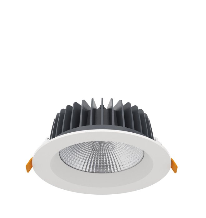 Корпус выполнен из литого алюминия, внешнее кольцо окрашено белой порошковой краской. Оптическая часть — фасетчатый алюминиевый отражатель с углом 60° или 90° и защитное стекло для равномерного акцентного освещения. Светильник снабжён пружинными креплениями. По запросу доступны варианты с аварийным питанием, диммированием и нужной цветовой температурой. Энергоэффективная замена ЛВО 2×26 Вт. Производство от 30 дней.