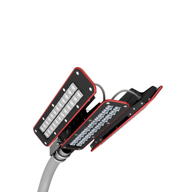 Корпус выполнен из алюминиевого профиля, крепежные элементы из нержавеющей стали, обеспечивают защиту от коррозии и долговечность. Оснащены вторичной оптикой с КСС «Ш» и «К», светодиоды с высокой эффективностью — более 115 лм/Вт. Предусмотрены два режима работы: дежурный (10% мощности) и тревога (100% мощности с реле 220 В). Производство от 30 дней.